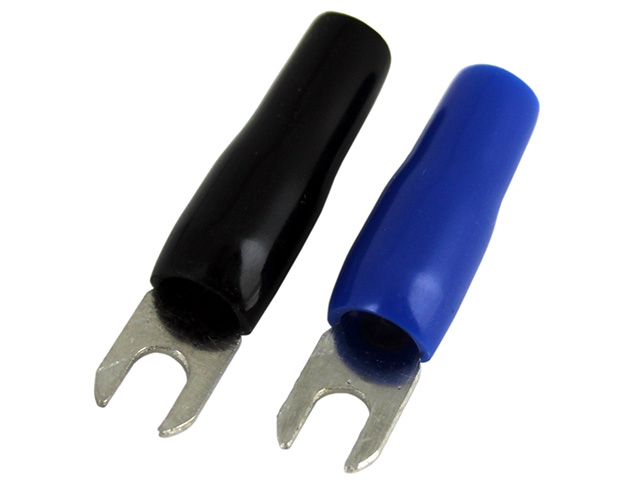 Garso stiprintuvo maitinimo laidu antgaliai (sakutes). Skirtos 8 mm² laidui. Komplekte 2 vnt. (melyna+juoda).